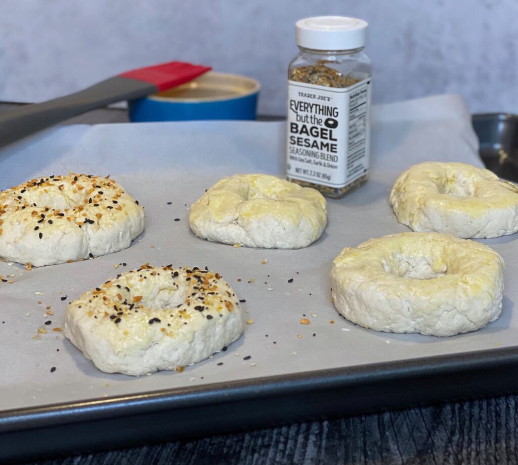- For bagels, brush the dough with a beaten egg that has been mixed with a tsp of water. Sprinkle tops with salt, everything seasoning, sesame seeds or just leave plain.