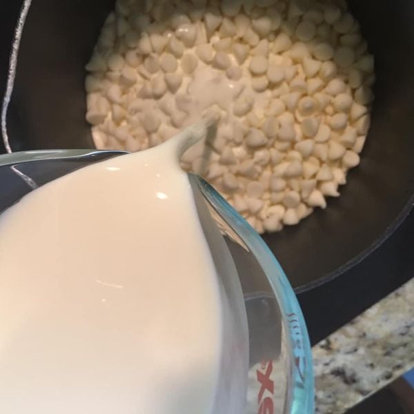 After the white chocolate chips and cream are melted together, you’ll add all of the ingredients according to the instructions (below).
