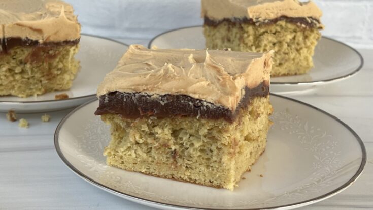 I used the 13×9 cake pan for ease, but if you really wanted to step this cake up, you could easily make this a layer cake and use the fudge topping as the center icing.