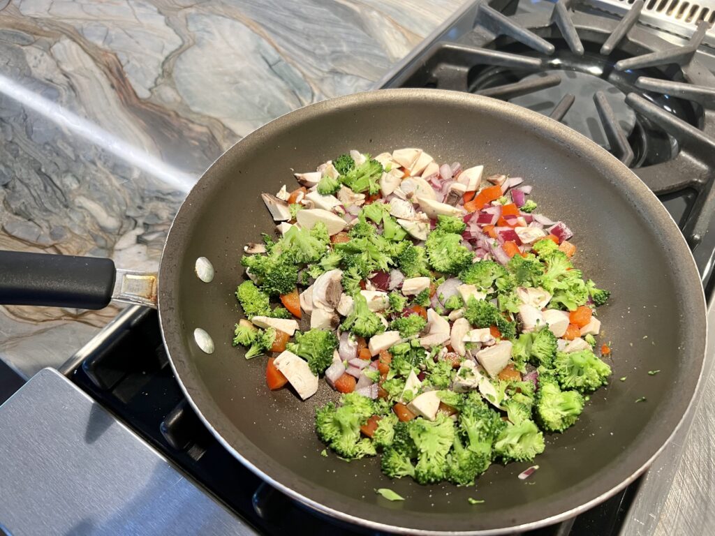 - Heat a pan or skillet over medium heat with 1 tablespoon oil. Dice your red onions and your red bell pepper and add them to the pan. Then, chop your broccoli and mushrooms and add them to the pan. Cook for about 5 minutes or until they're slightly soft.