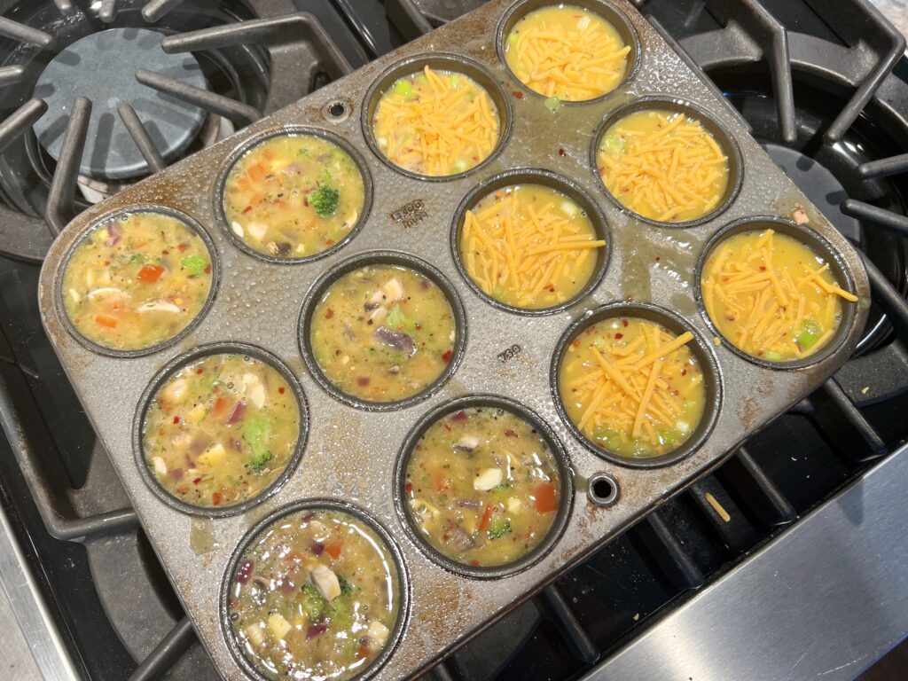 The baking time is the same for the cheesy bacon egg bites and the veggie-packed egg bites, so you can easily fill a 12-muffin tin with 6 of each.