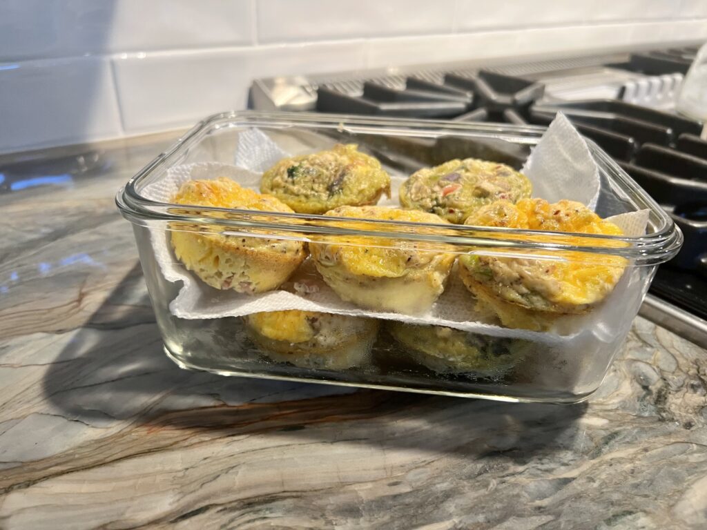 They can be enjoyed for about 5 days after making them. Just place a couple of baked egg bites on a plate or in a microwave-safe container and heat them on high for 30-40 seconds.