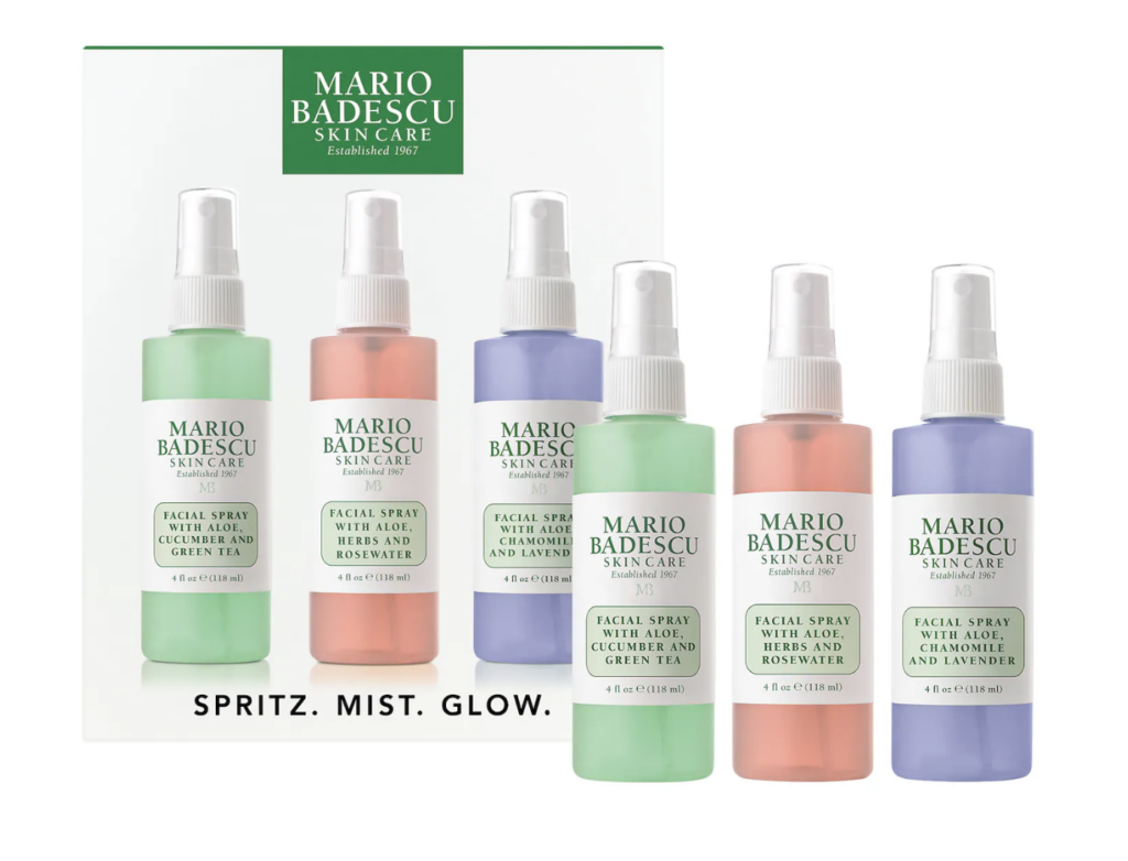 Brighten your complexion with this Mario Badescu Face Spray Trio. One is rose, ane is cucumber and green tea, and the last one is lavender. Made for all skin types!