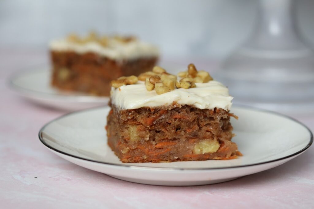 Since the real point of this recipe is to allow you to have your cake and eat it too, I suggest baking this carrot cake in a 9×13 pan and then cutting it into 18-20 pieces.