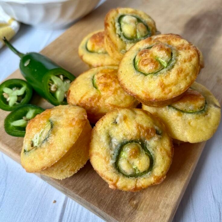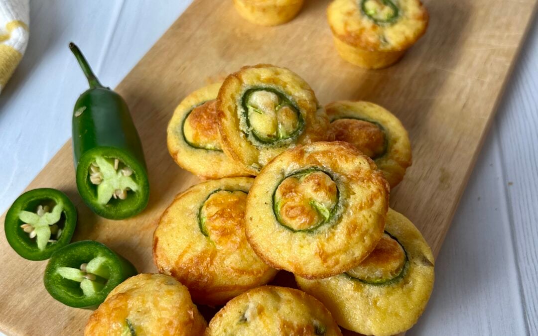 Remember, heat comes from the seeds with jalapeños. I like to use the pickled kind for the batter but I think the fresh jalapeño slices on top make a prettier touch. Just remember to remove the seeds before baking.