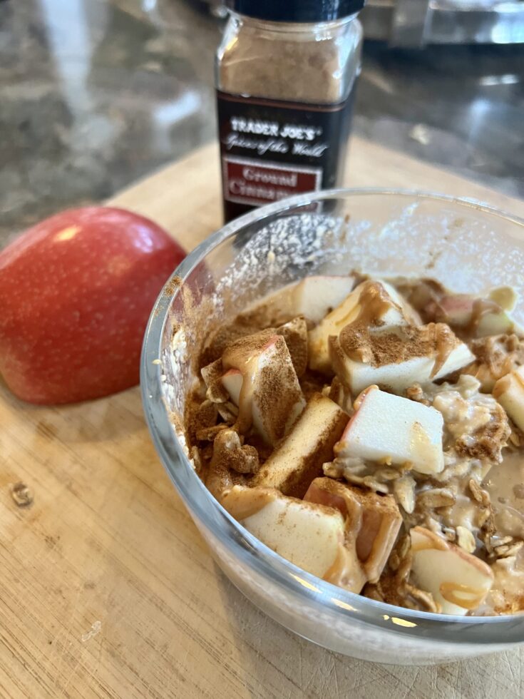 When making Peanut Butter Apple Cinnamon Overnight Oats, you’ll include all of the ingredients you would in classic overnight oats with the addition of peanut butter in the base.