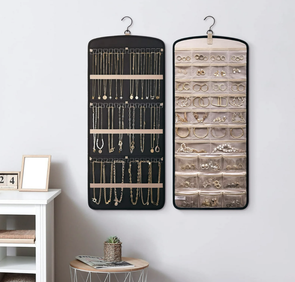 You can also store jewelry in your closet if your jewelry box is full. I like this hanging organizer because it doesn’t take up a lot of space and it can hold everything from my earrings to my necklaces.