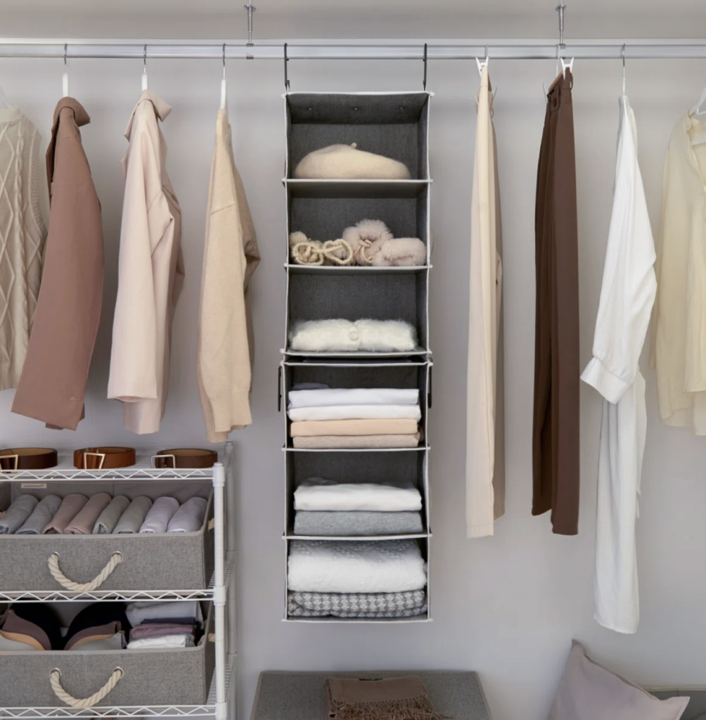 And if you want to fold some items in your closet, a hanging cube organizer offers the perfect place to put everything.