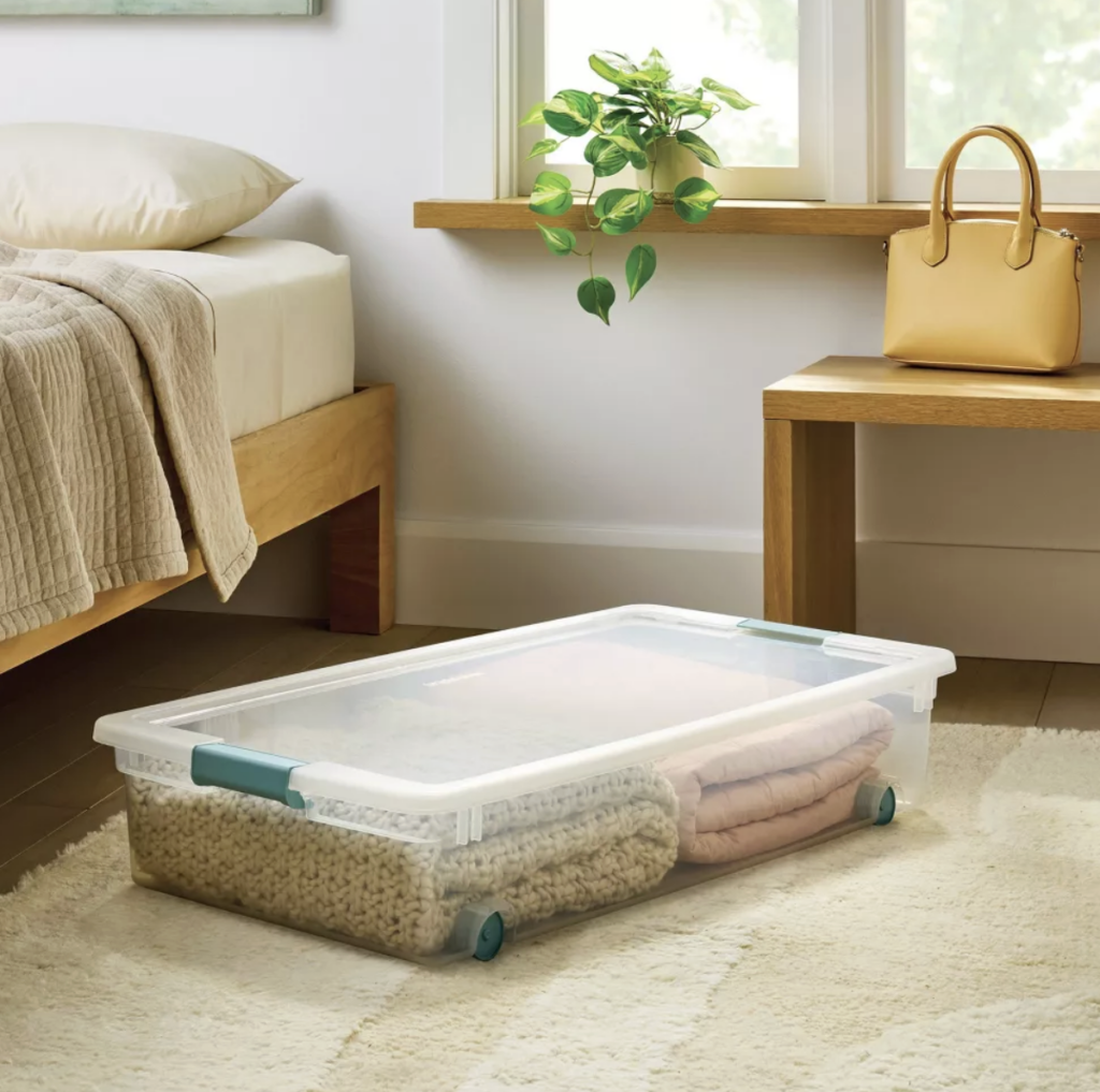 One of the best ways to do this is by putting your clothes or shoes under the bed in one of these clear organizers. I like that there are wheels on the bottom of it too—making it simple to pull it out when you need it.