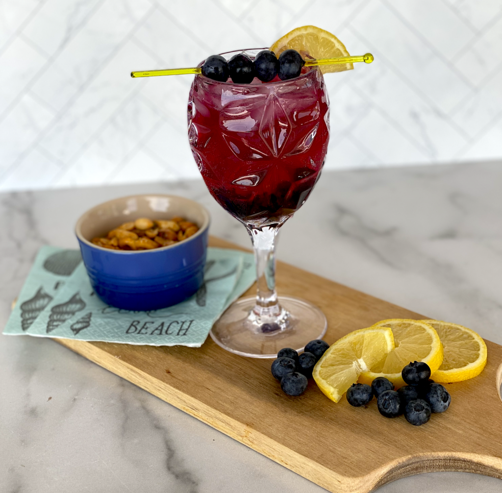 - Finish off with vanilla seltzer. Add a skewer of fresh blueberries for garnish!