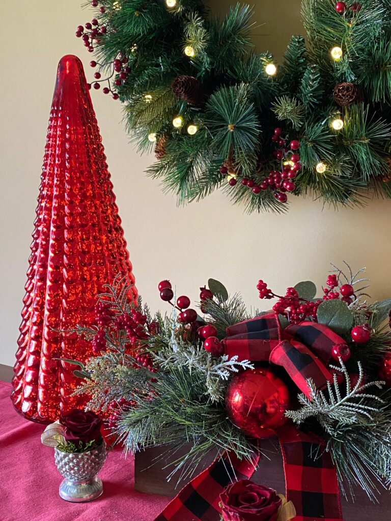 This Luminara Holiday Wreath adds a traditional Christmas look to my space. It can be put almost anywhere! Here, it’s on a charger plate but it also looks nice on a cake plate or as a centerpiece too.