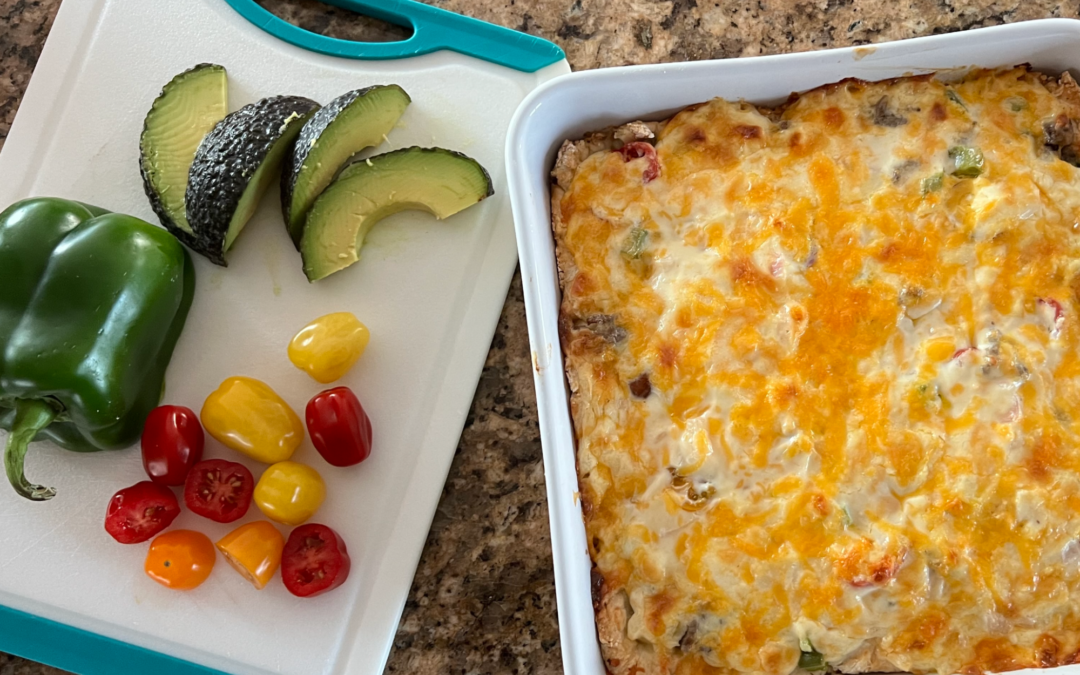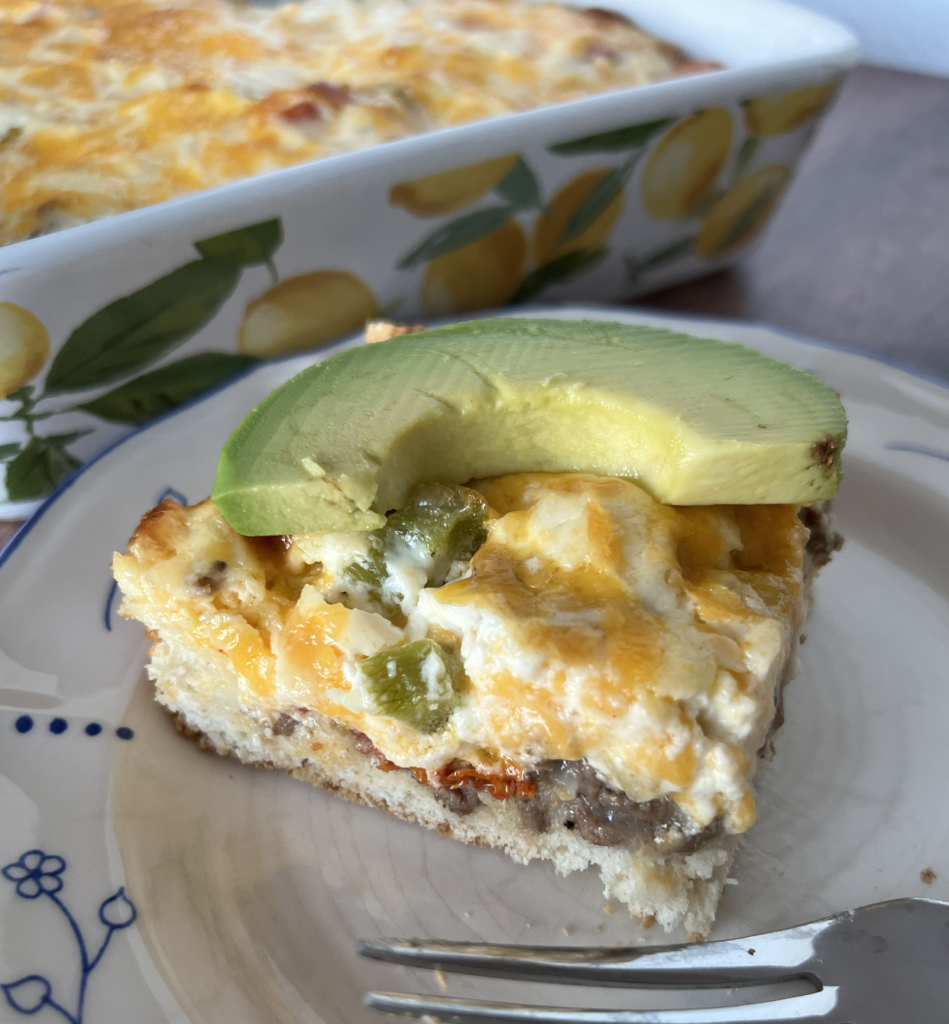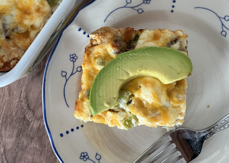 - Let sit for a few minutes before cutting into squares and serving. I like to garnish with an avocado slice.