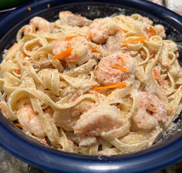 I’m not sure if I stumbled across this recipe in a magazine or a cookbook at the library (I was on such a tight budget, I would check out cookbooks and then copy down recipes that I thought seemed easy to make!) This fettuccine with shrimp recipe really IS easy to make. As my hubby, Doug, says, “this is really tasty!”