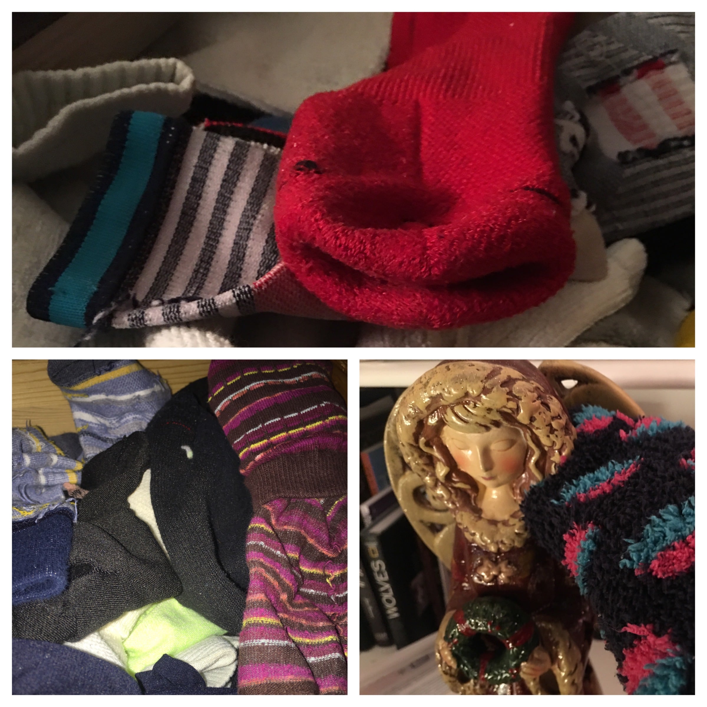 Dump those sock drawers and start matching! If they have holes or are stretched out, get rid of them. If you have any singles, keep a couple to use as dust rags. I love to use a fluffy sock over my hand to dust home decor items like vases, collectibles, candles and lamps.