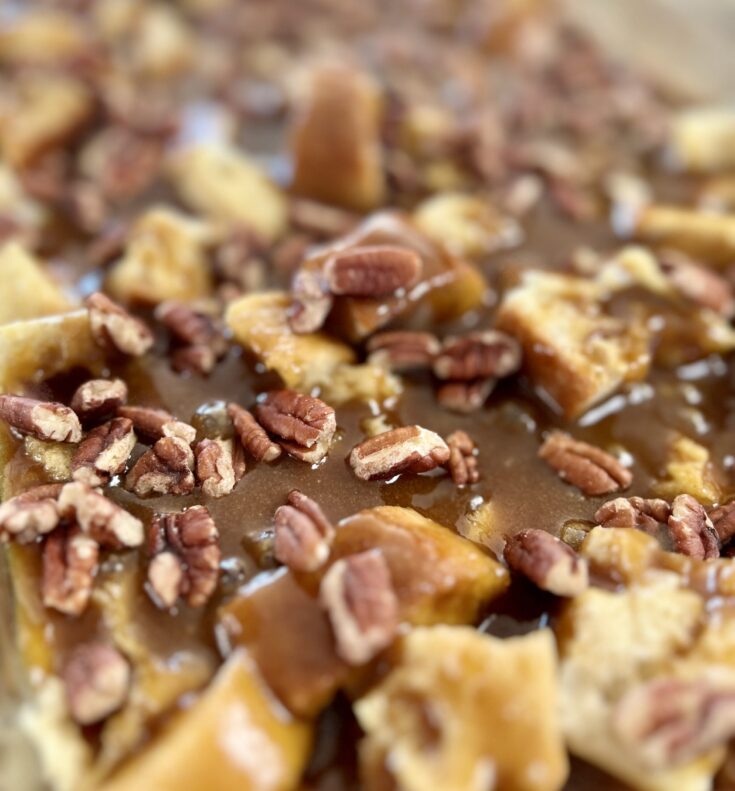 If you have any leftovers (and I have to say, that’s a BIG if!) this sweet breakfast casserole recipe tastes pretty good heated up the next day. And can I tell you something? It’s even good if you don’t heat it up. I mean, it’s bread and a caramel like syrup with toasty pecans. Sounds good to me any way you serve it up!