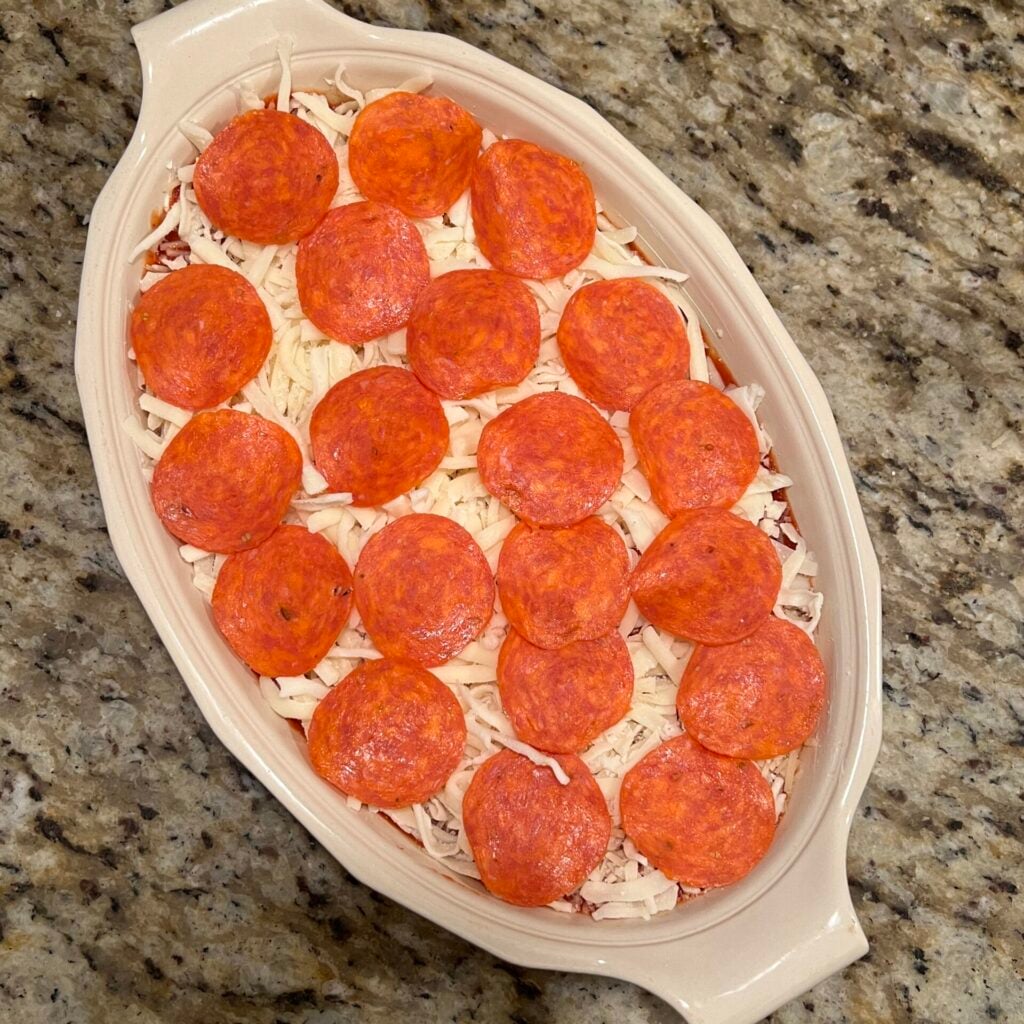 After mixing everything together you spread the mixture into a pie plate (or a similar baking dish) and top with pizza sauce or marinara sauce, a blend of cheeses, and pepperoni.
