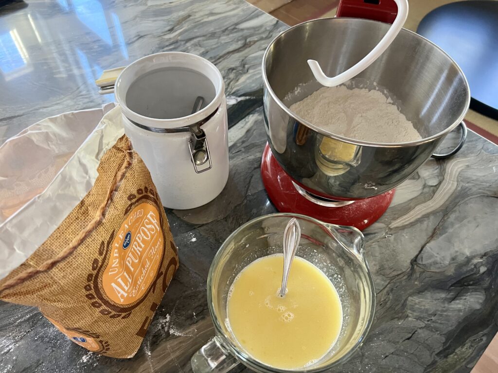 I always turn to my KitchenAid. You’ll also need a dough hook, so no matter which stand mixer you use, ensure the hook is on hand!