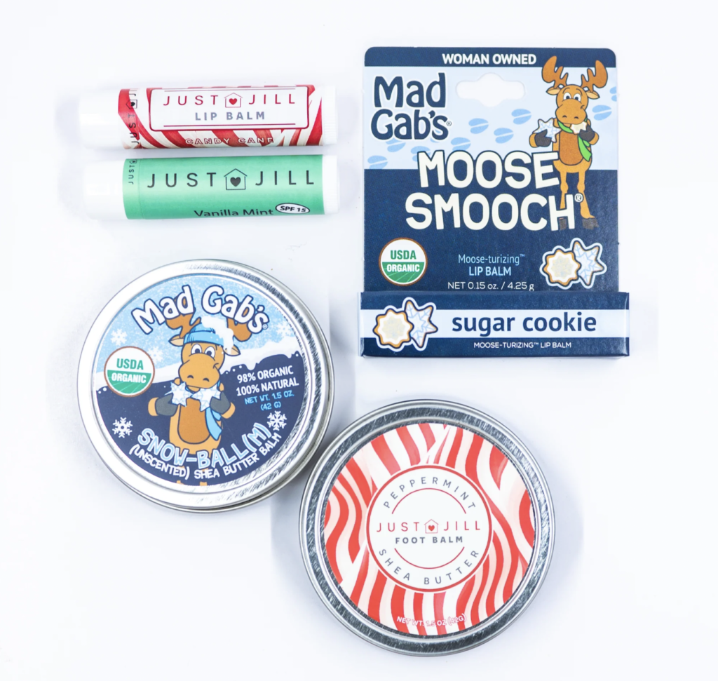 It includes an unscented shea butter balm, a shea butter foot balm, a moisturizing lip balm, and two Just Jill balms.