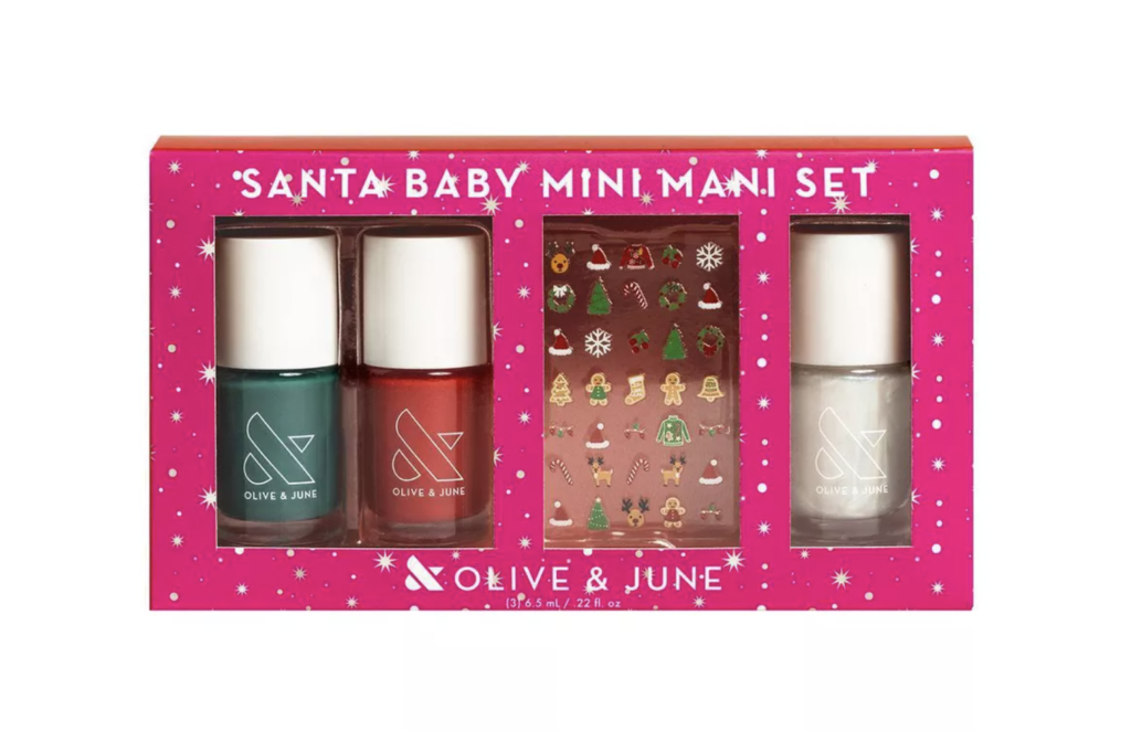 I love this Santa Baby Mini Mani Set that includes four nail polishes and holiday-themed stickers for the perfect Christmas manicure!