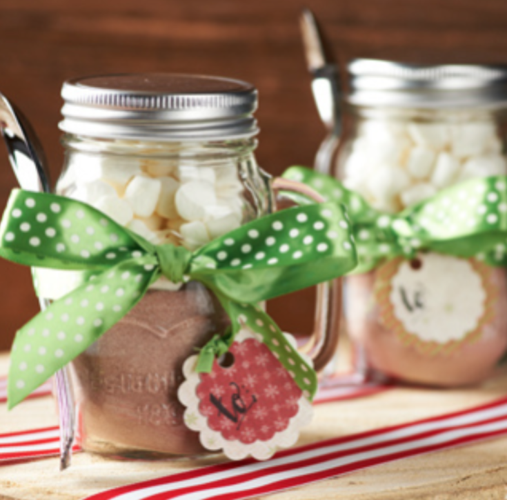 - Divide the powdered hot chocolate mix evenly between the two mason jars. Next, pour the mini marshmallows over the hot chocolate. Replace the covers on the mason jar mugs.