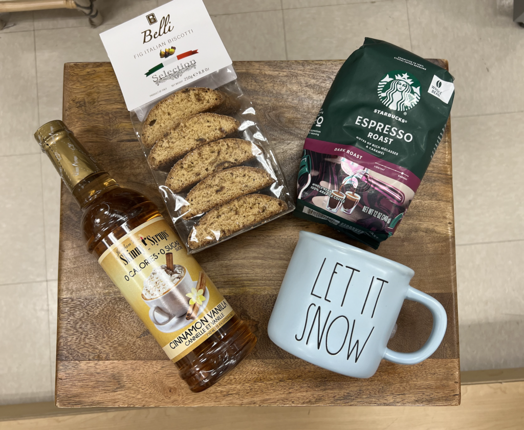 You can include a mug, a bag of ground coffee (or whole bean), some biscotti and a flavored syrup to make them feel like they’re at the barista’s bar!