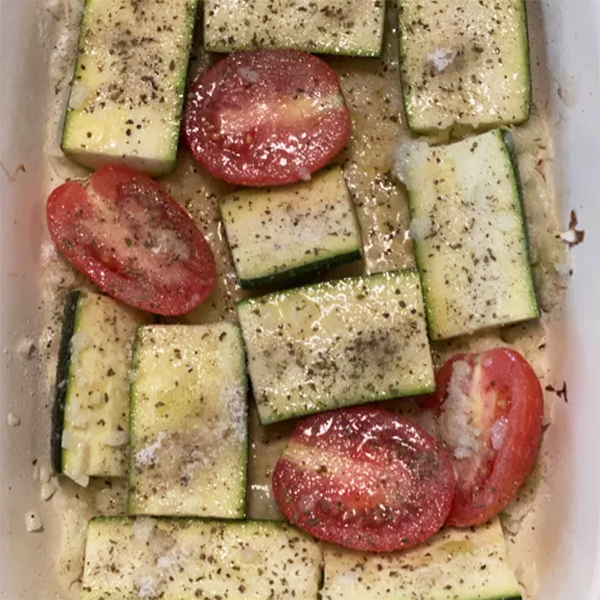 - Place melted butter in 11″ x 7″ baking dish. Sprinkle diced onion over butter. Add zucchini and tomato wedges in rows, cut side up.