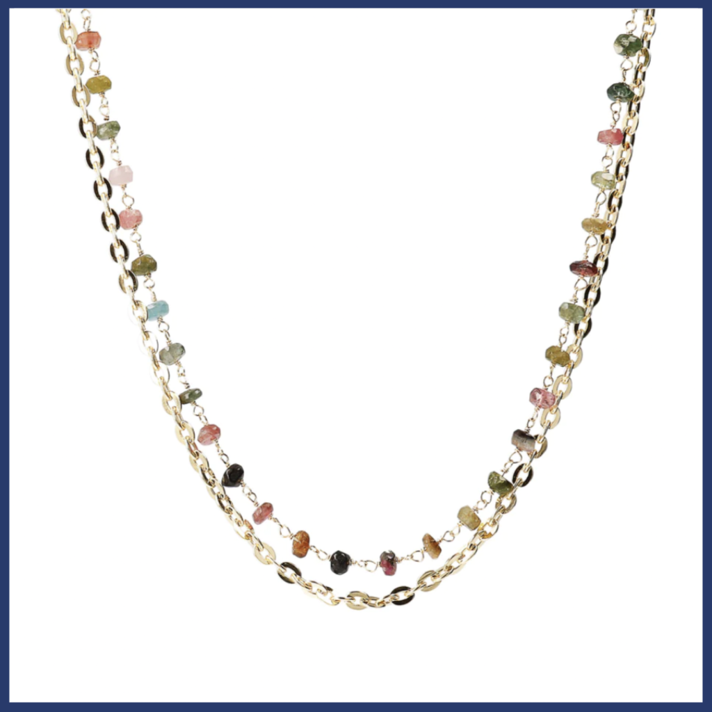 This layered necklace from our Bellissimo Bronzo collection is a new addition and it’s just so fashionable! I love the small Nuggets of the tourmaline that showcase all of the beautiful colors. Thanks to the layering of the chains, it makes this piece easy to wear.