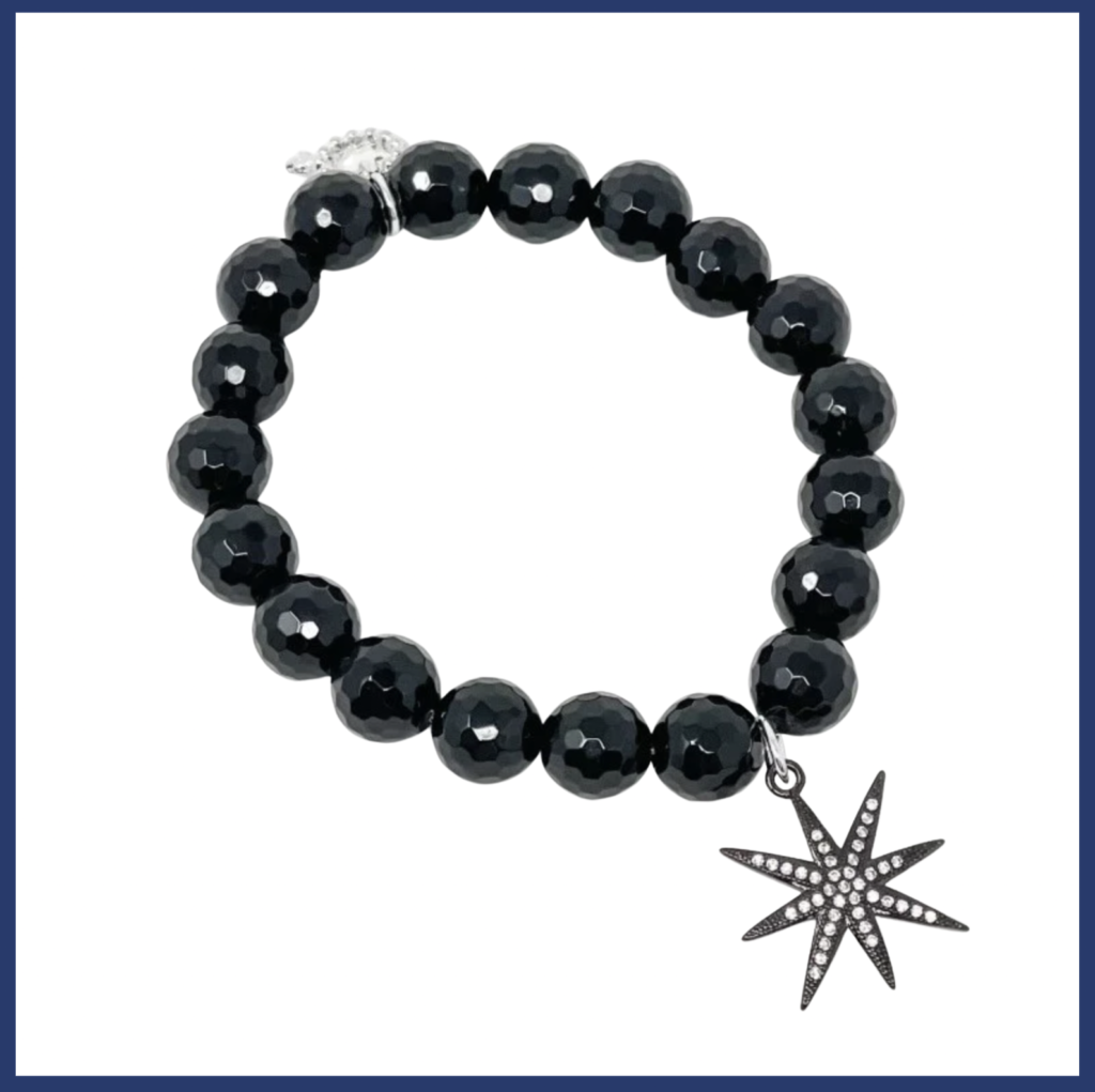 This is the slightly smaller 10 mm bead size and I am obsessed with the shimmer from the faceted black onyx. I’ve always been a fan of gunmetal tones with black, so this crystal-encrusted Northstar was the perfect accent for this bracelet!