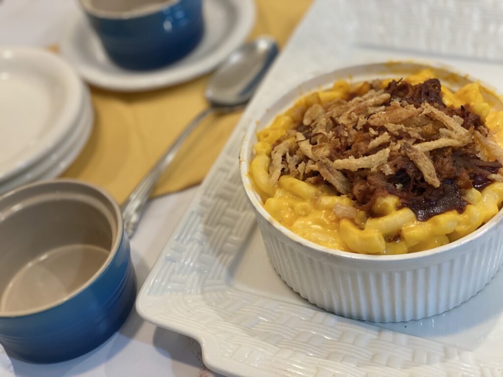 Macaroni and cheese is often a side dish with ribs and barbecue. But what if we put pulled pork in the macaroni and cheese? Oh yeah. We’re doin’ it!