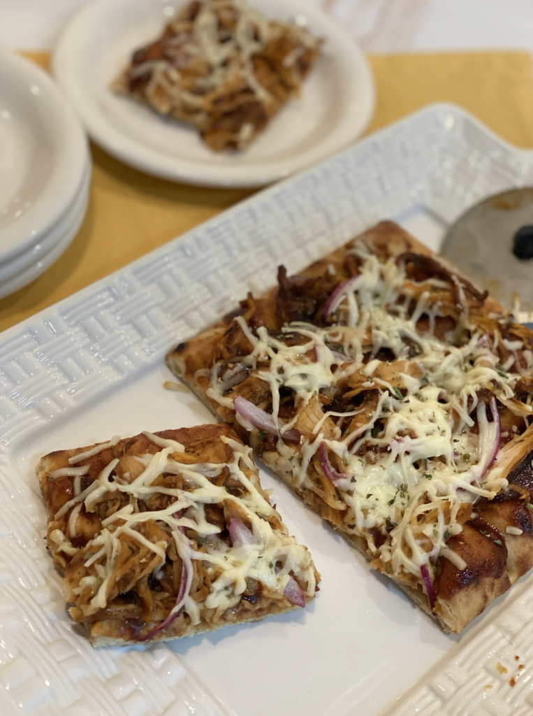 Any pizza lovers out there? Another way I love to use pulled bbq chicken is on a store-bought pizza crust.