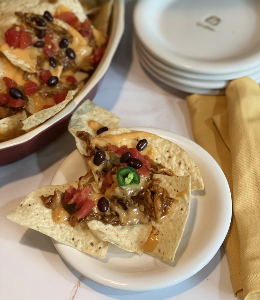 When I’m in the mood for something super easy and quick, nachos are one of my go-tos. And while ground beef is a typical option you may find in a restaurant, I’m a huge fan of pulled pork or pulled chicken nachos.