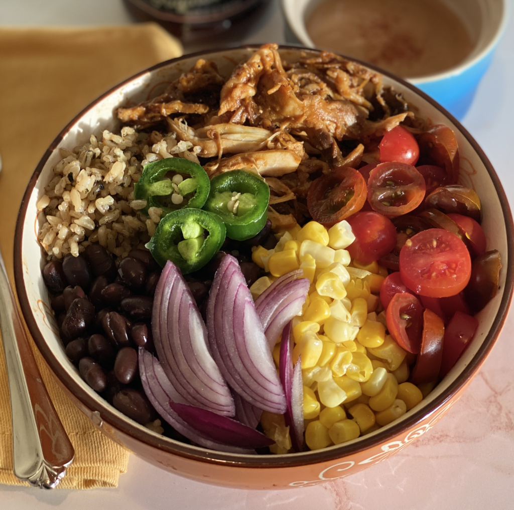 One of my new favorite ways to use pulled BBQ chicken is to make “rice bowls.” I just heat up the chicken, and start bowl building! These are a great way to use things in your fridge or pantry. There are no rules, just layer in what you love!