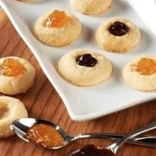 - Remove the cookie sheet from the oven and using the back of a teaspoon, immediately make an indentation in the center of each cookie. Fill the centers with jam.
