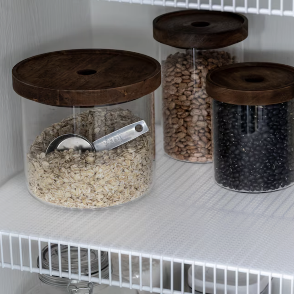 If you store a bunch of dressings, sauces, or oils in your pantry, you might want to use this Shelf Liner from Walmart. It helps protect against spills and it can be cut to fit the surface of your shelf. And if you take a close look, you’ll see that the plastic is ribbed—providing some traction for your pantry essentials.