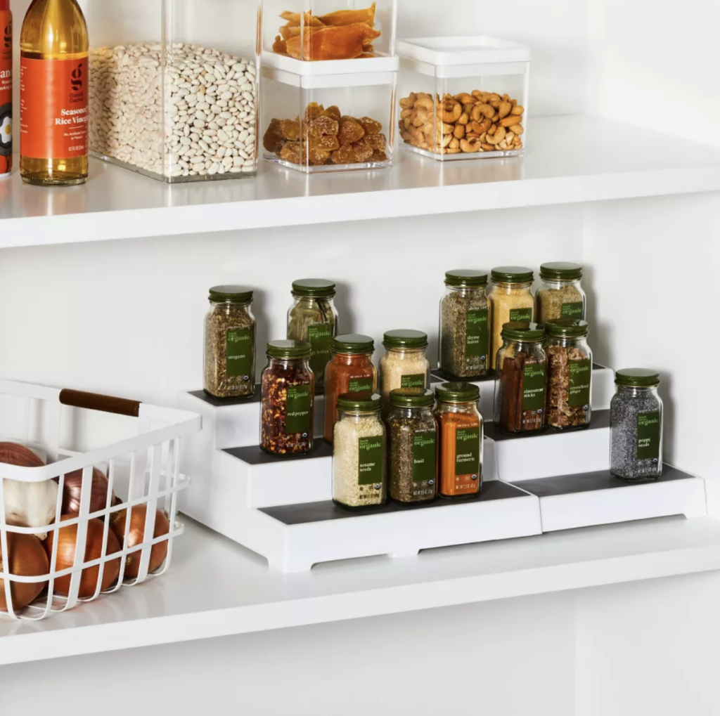 Head over to Target to grab a set of these Expandable Pantry Organizers. You can use them for cans or spices, and they’ll help keep everything visible.