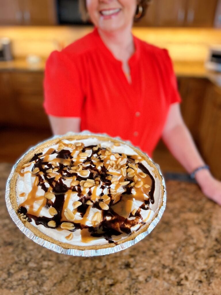 You won't believe that this pie is light and low in fat... it's that rich and heavenly! Creamy and topped with crunchy peanuts, each bite is sure to bring you pure joy!