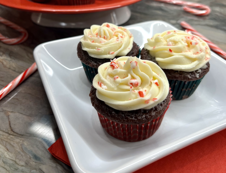 Take a bite of holiday cheer with this cupcake recipe that features a chocolate base, white chocolate frosting and peppermint throughout!