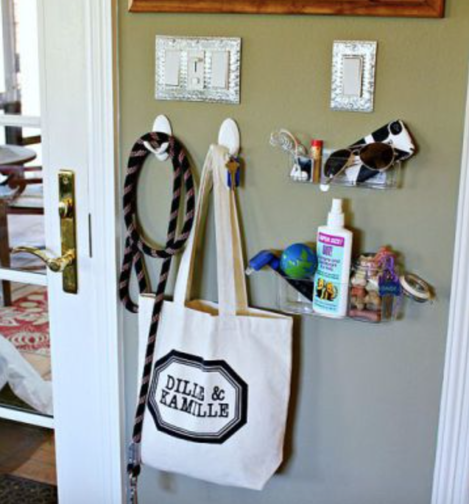 Place those removable Command strips on the wall to hold the leash and anything else you need for your walk. You can also add an adhesive supplies holder (like the ones you put in your shower) to hold toys, treats, and more!