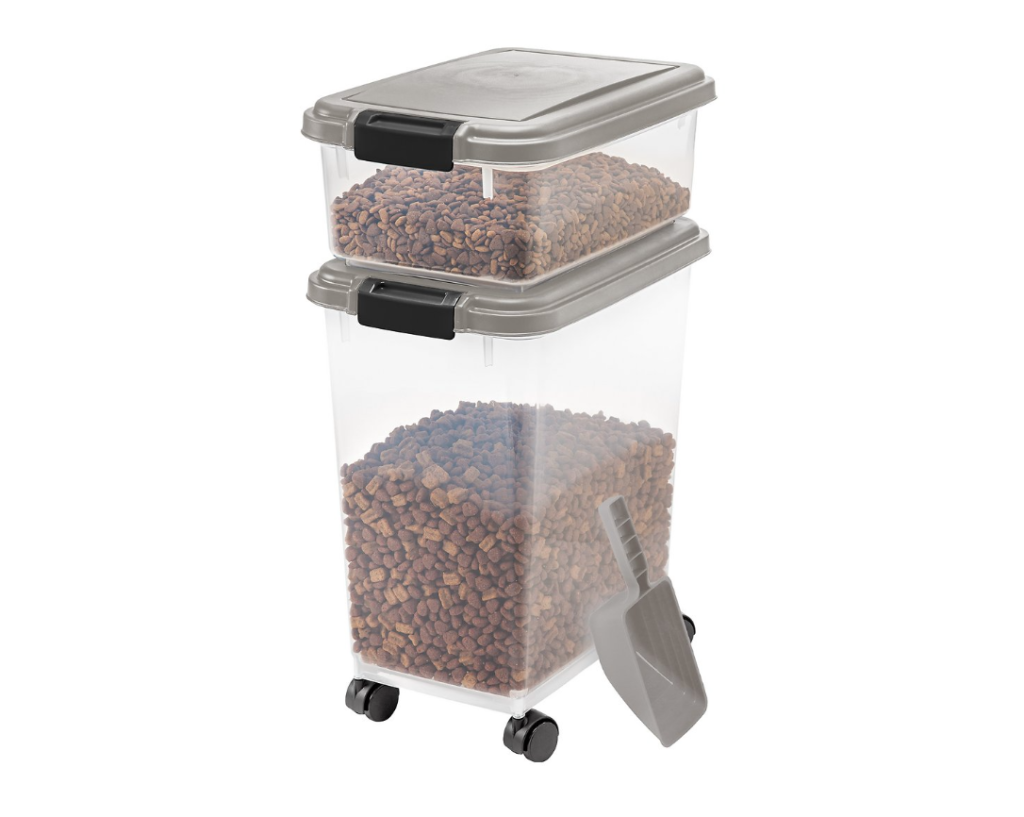 First is this two-piece airtight storage container. It includes two bins (one small and one large) that easily stack on top of one another. It also includes a helpful scoop!