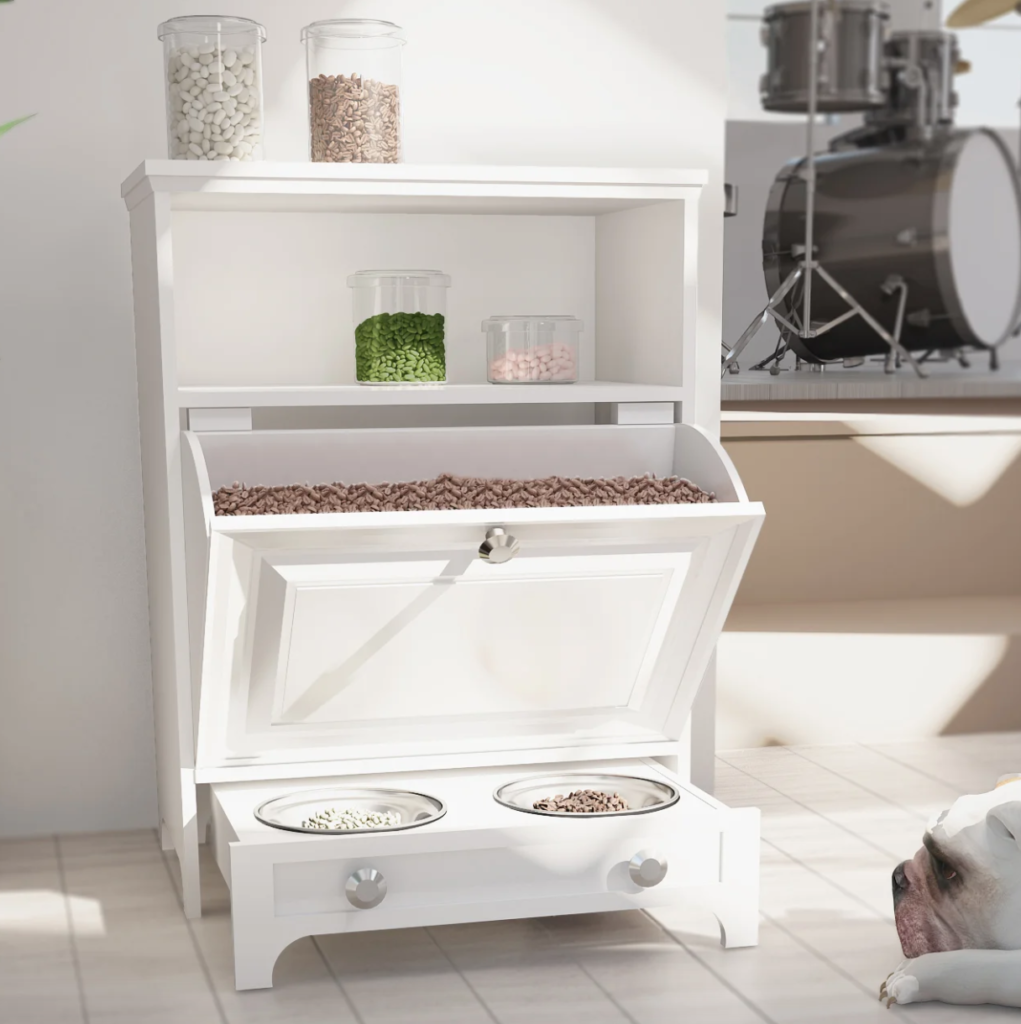 It’s a little on the pricier side, but it’s really an all-inclusive option. The bottom features a drawer with two food bowls and above, you’ll find a pull-out cabinet to hold bags of pet food. There are even a couple of shelves to house treats.