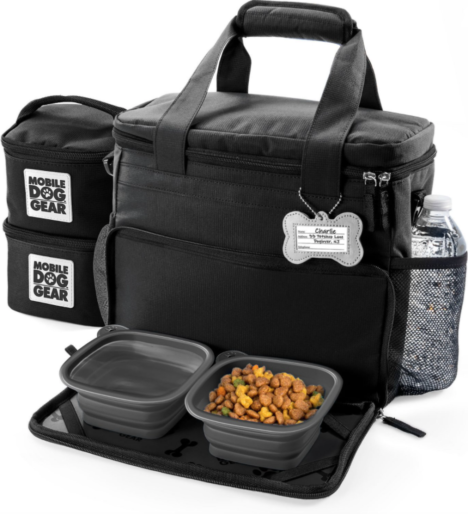 It’s called a Mobile Dog Gear Week Away Tote and it truly has a space for everything. In addition to carriers for food and treats, there is a large main compartment, mesh pockets, and zippered sections for all of those toys!