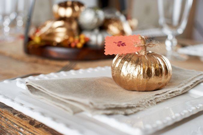 I created these pumpkins a while ago on QVC, but the great thing about them is that they’re timeless! All you need are some small real or faux pumpkins, gold paint, and a paintbrush.