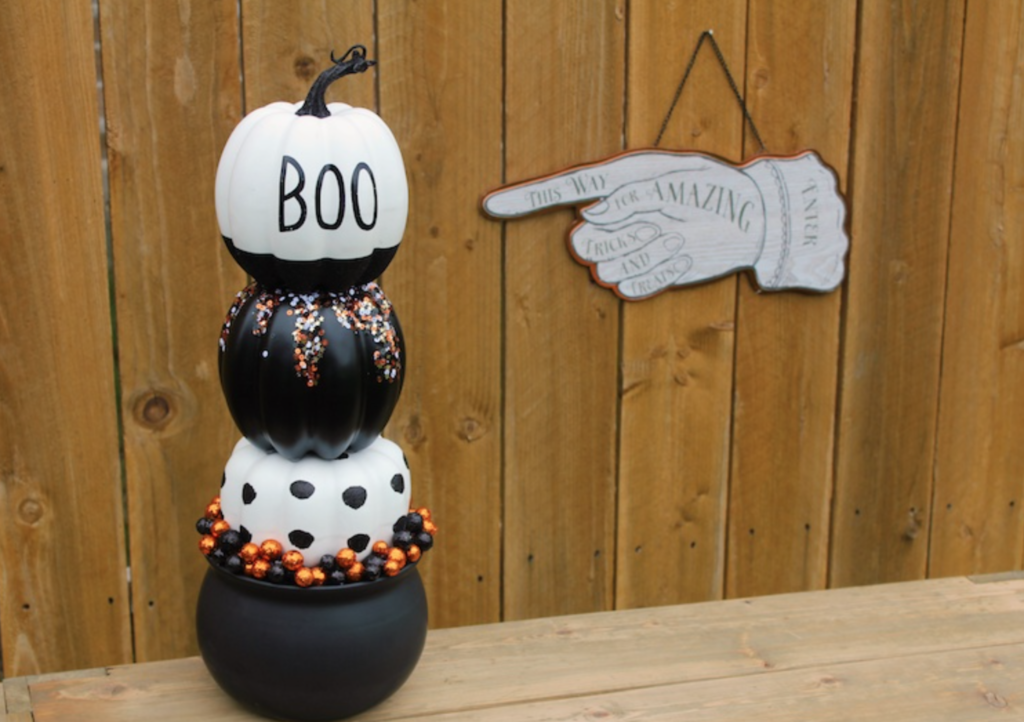 To create the base, cut a cardboard circle to fit the top of the cauldron. Make sure it fits the top perfectly! Under the cardboard, you’ll place the foam in the cauldron. Decorate each pumpkin with paint, gems, or whatever you can think of. From there, stack the pumpkins and secure them in place with hot glue.
