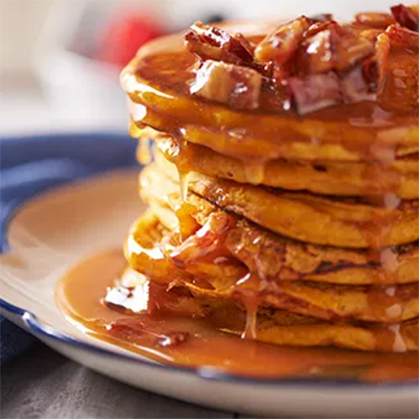 Pumpkin Pancakes with Salted-Caramel-Bacon Syrup