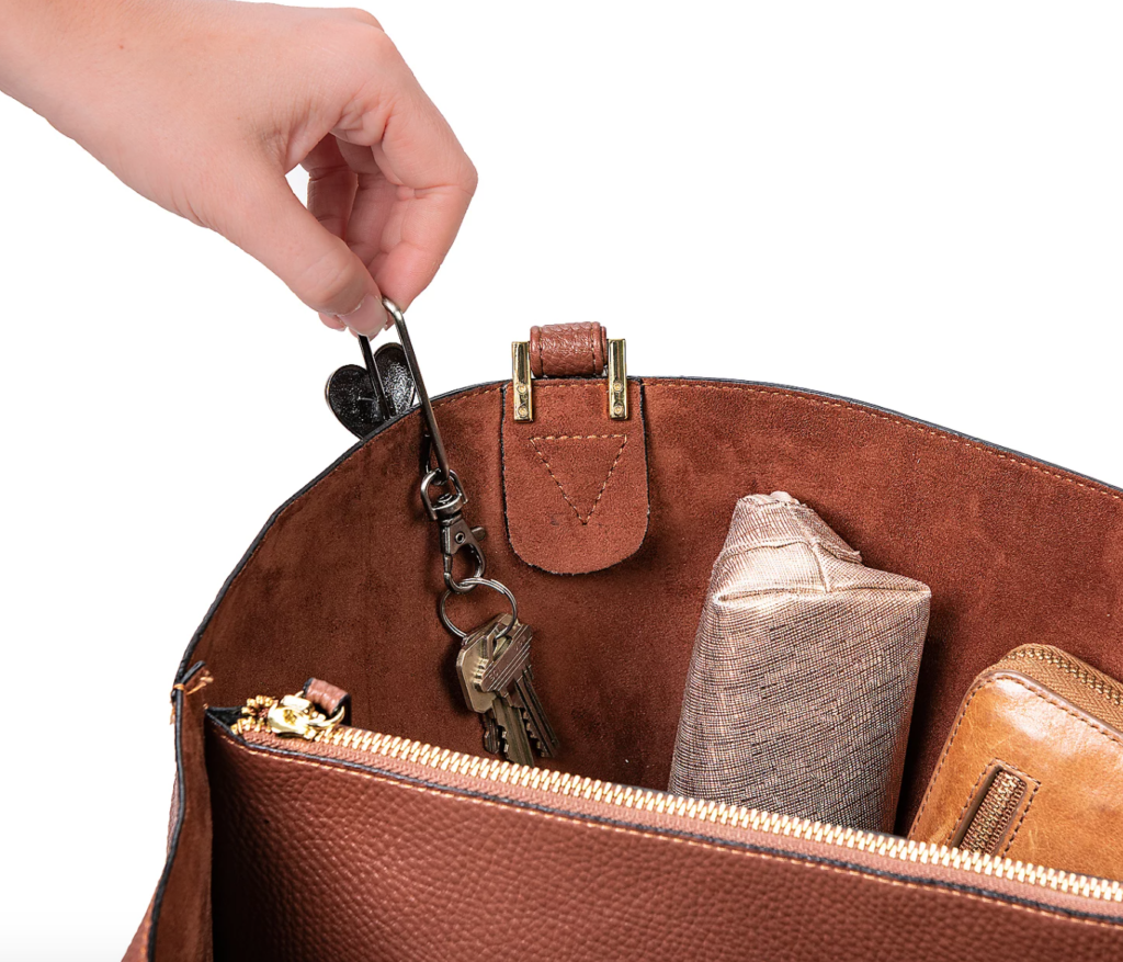 Just attach your keys to the claw clasp on one end, and slip the curved end over the edge of your bag. The keys should sit on the inside of your purse so that they aren’t exposed, and the finder works best on tote bags.