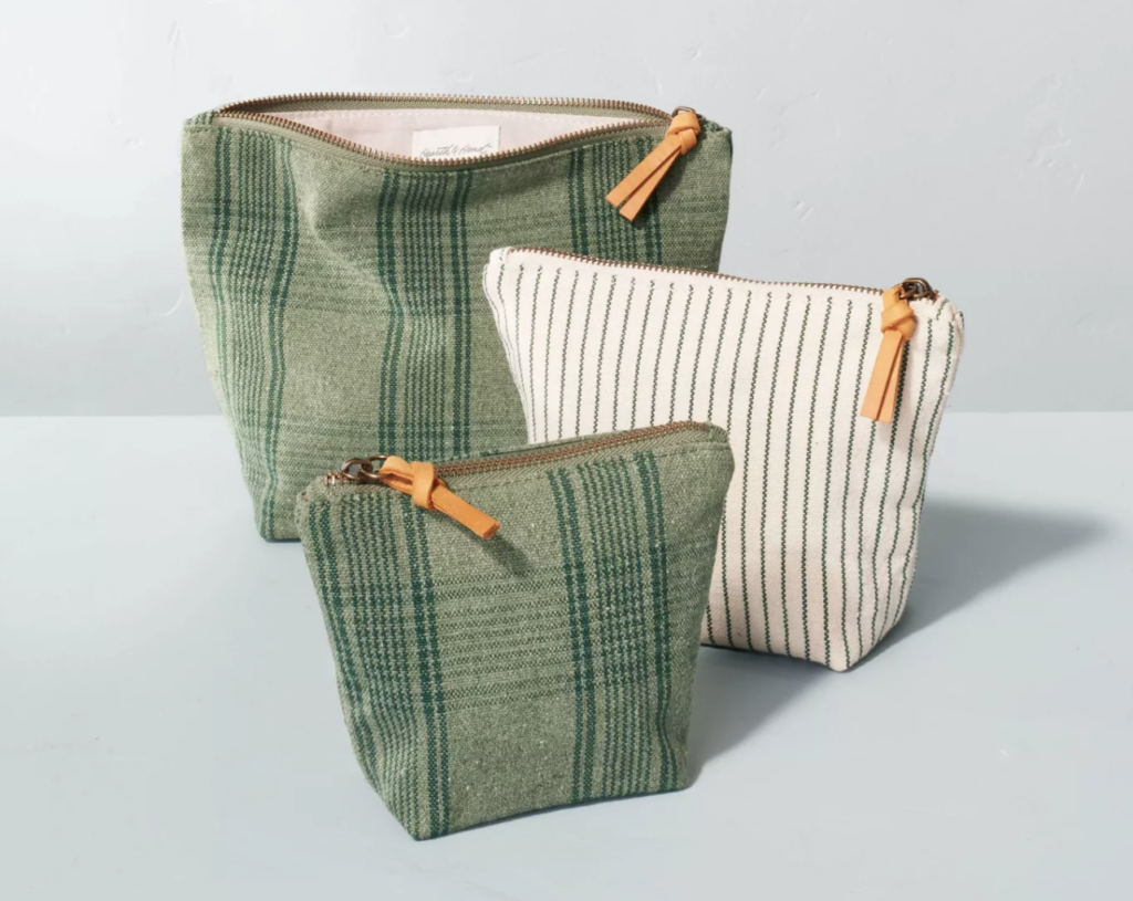 The simplest way to keep makeup organized is with small cosmetics bags. I like this 3-piece set from Target because I can interchange the bags depending on what size purse I’m carrying.