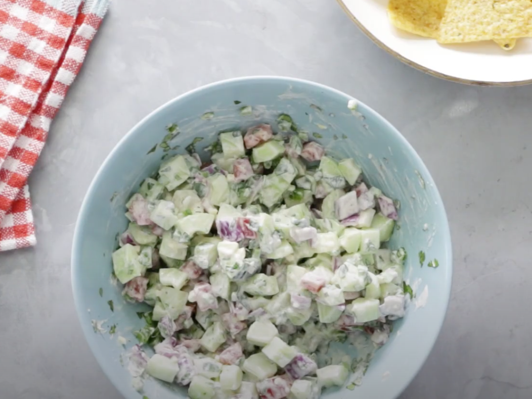 - Pour over the cucumber mixture and toss gently to coat. Serve immediately with chips.