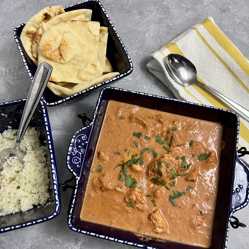 And if you’re trying to keep an eye on your carbs, consider using cauliflower rice. It’s delicious with the masala sauce.