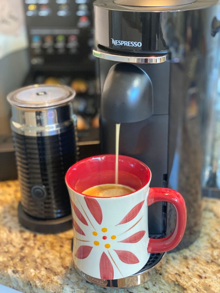 While he’s getting ready, I like to make myself a cup of coffee with my Nespresso Machine and Aeroccino Frother.