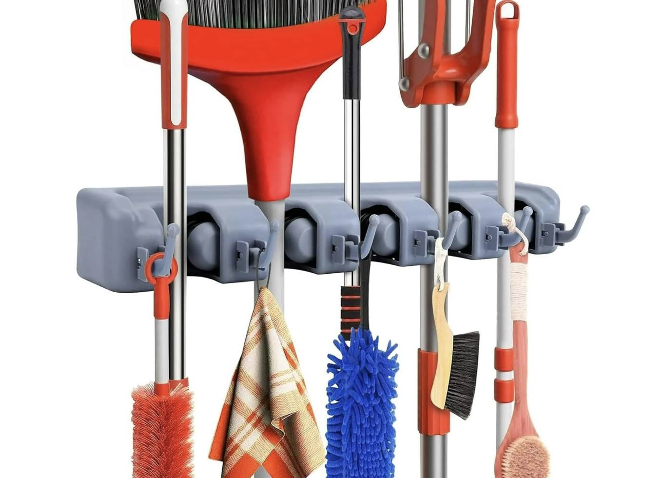 Mops, brooms, dusters… oh my! Keep them out of the way with this helpful holder that easily attaches to a wall.